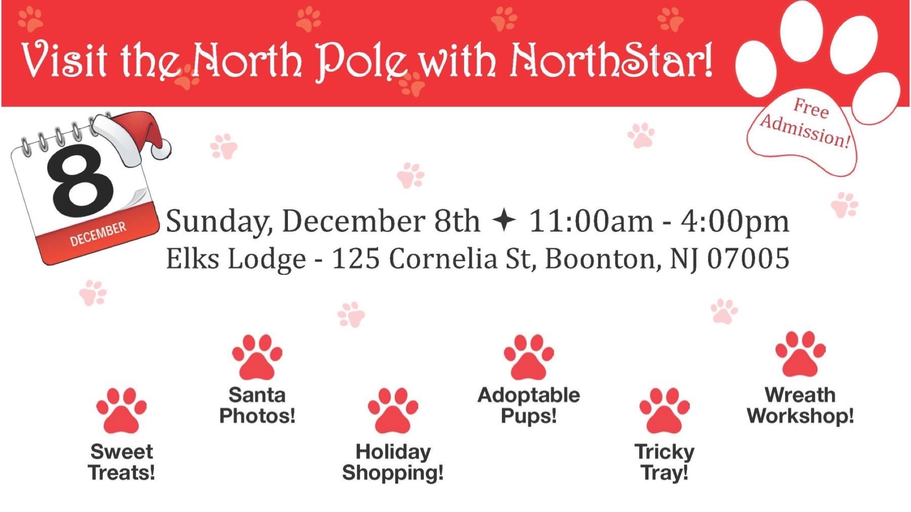 Tis the season! Visit us at the North Pole with NorthStar! ***Wreath Decorating Workshop*** Our NorthStar elves will help you design & decorate your own holiday wreath. You choose your bow, ornaments & optional dog/cat &/or personalized name plate. ***Cookies & Cocoa for a Cause*** Take a break to enjoy a cup of cocoa, coffee...
