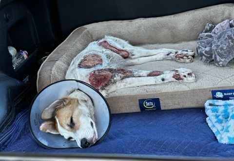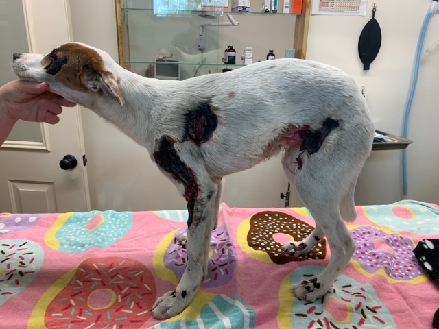 Fanta had huge areas of skin torn from multiple areas of her body. It’s always impossible to know how this occurred, but it’s likely was either intentionally dragged behind a car, or got caught under a moving vehicle which caused the extensive road rash. The shelter got her stabilized and reached out to NorthStar for help. We’ve seen a lot, but nothing could prepare us for the photos we received.